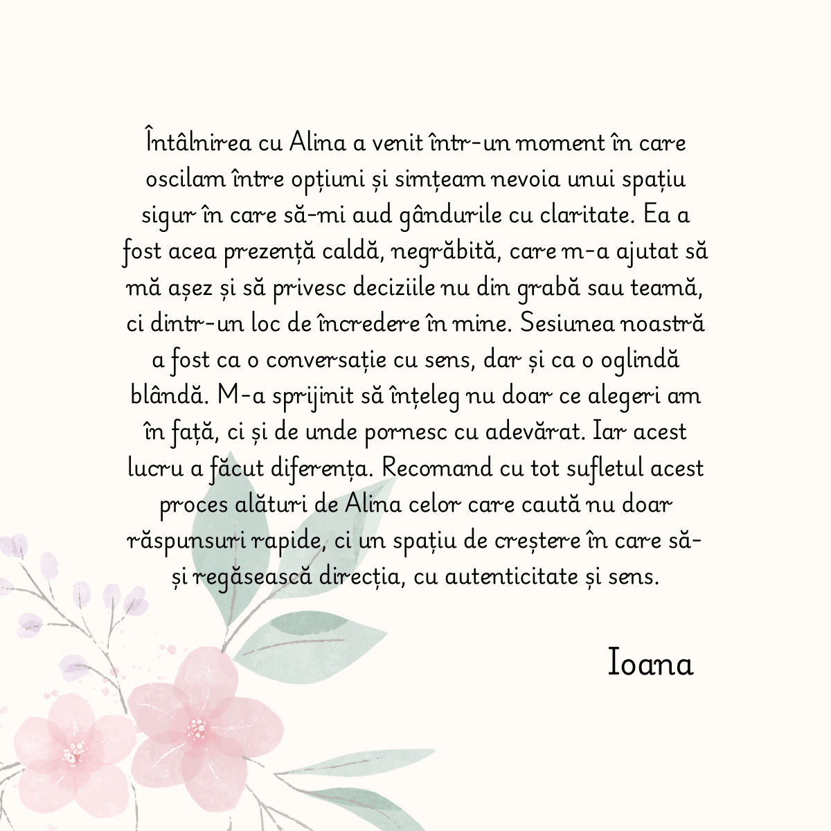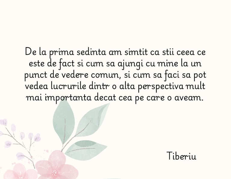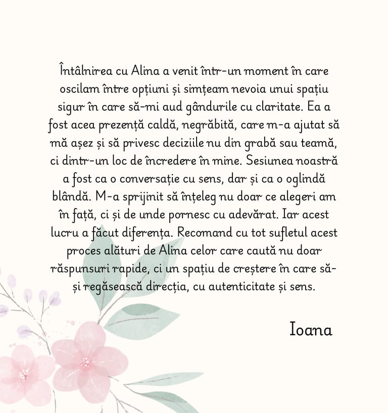 Îți ofer spațiul și ghidarea de care ai nevoie pentru a-ți înțelege valorile, a depăși blocajele și a construi o direcție care ți se potrivește cu adevărat.